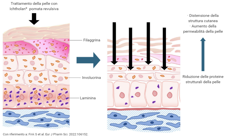 Il pus accumulato in profondità nella pelle può scorrere via più facilmente perché la struttura cutanea è stata allentata (effetto assorbente). La struttura cutanea allentata permette al principio attivo ittiolo di penetrare negli strati cutanei e di combattere i batteri. L’infiammazione viene alleviata. Lo studio dimostra inoltre che maggiore è la concentrazione del principio attivo, più profondo è l’effetto dell’ittiolo a livello cutaneo.
